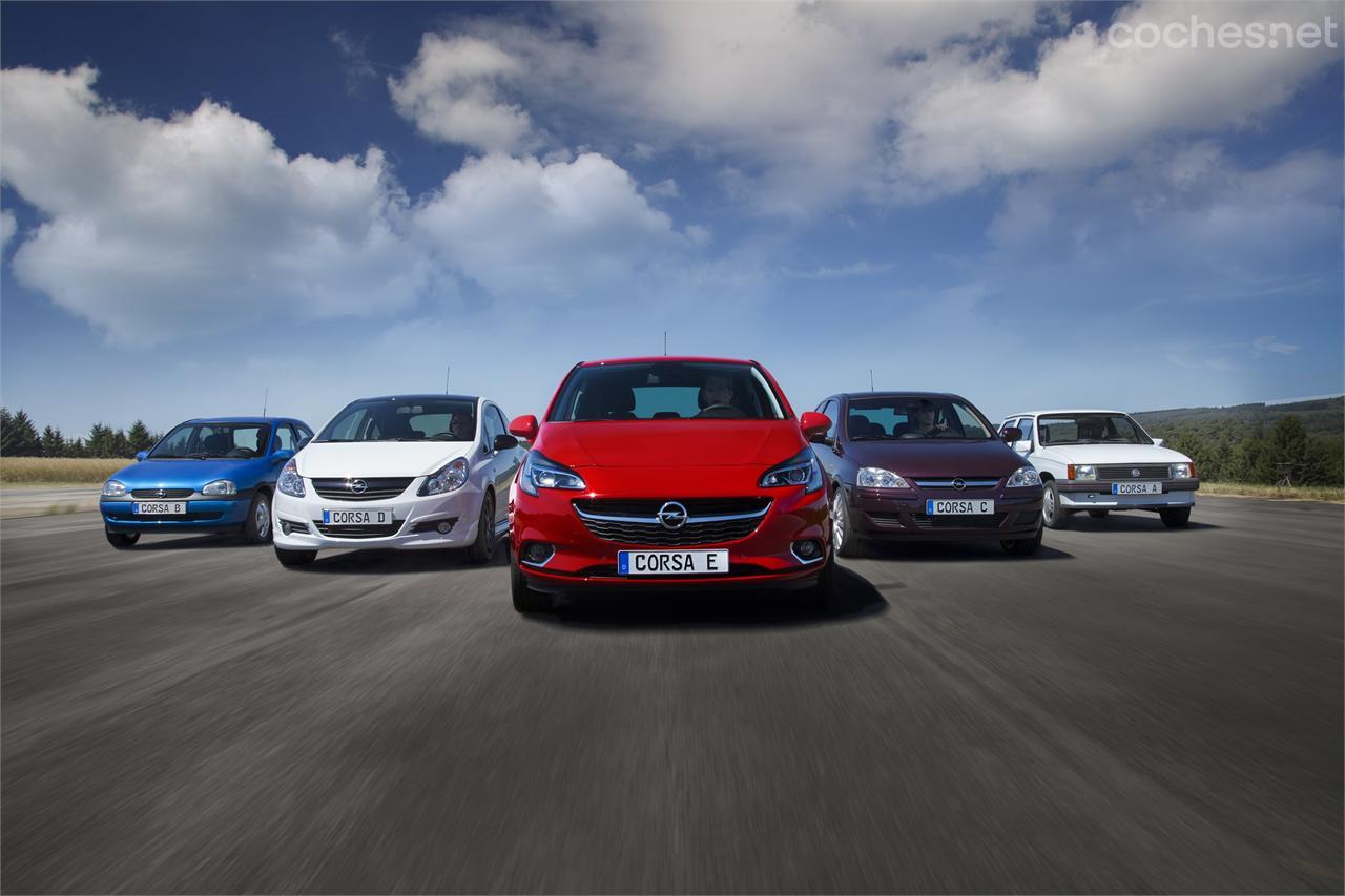 | Opel ha vendido más de 12,4 millones de las cuatro generaciones anteriores del Corsa, aquí escoltando al nuevo en orden, de izquierda a derecha de segundo, cuarto, quinto, tercero y primero. |