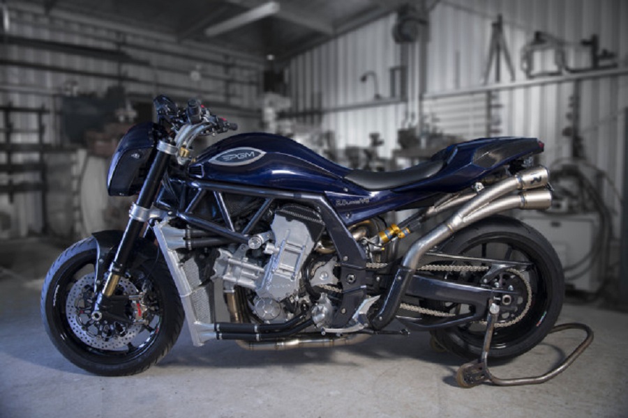 También se han preocupado en mantener el peso a raya, cosa que no sucede en otros prototipos o creaciones no profesionales. Con el depósito lleno son unos 242kg. La mayor parte se la lleva el motor así que han tenido que aligerar con el resto: el chasis tipo trellis está protegido con unacantidad ingente de carbono, el subchasis es de aluminio y los 2 tubos de escape 4-2-1 son de titanio. Estos han sido diseñados exclusivamente por Akrapovic para esta moto. Siguiendo con componentes, la guinda la ponen unos Öhlins delante y en la amortiguación trasera, frenos Brembo monoblock, llantas de magnesio Marchesini y neumáticos Michelin.